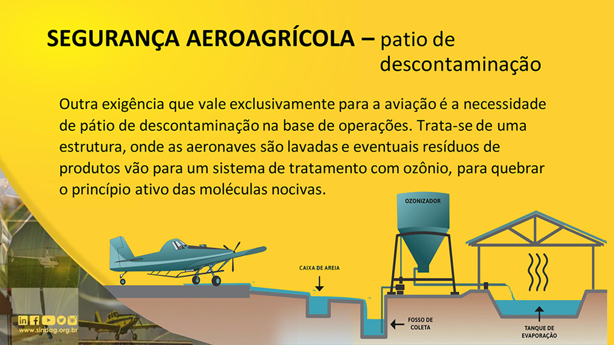 As obrigações da aviação agrícola abrangem ainda a necessidade de cada empresa ter seu pátio de descontaminação. Neste caso, um espaço com piso de concreto impermeável onde a aeronave é lavada (descontaminada) após cada operação e a água dessa lavagem vai para um sistema de tratamento de efluentes. Onde passa ainda por um sistema de aplicação de ozônio para quebrar as moléculas dos agrotóxicos e indo para um tanque de evaporação. Tudo impermeabilizado para evitar contaminação do solo.