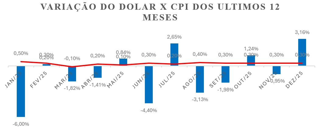 O CPI dos EUA (dezembro/2025) indica que a inflação segue em trajetória de desaceleração gradual, porém ainda acima da meta de 2% do Fed. No mês, o índice cheio avançou +0,3%, puxado principalmente por habitação (shelter), enquanto no acumulado em 12 meses o CPI ficou em +2,7% e o núcleo (CPI ex-alimentos e energia) em +2,6%. Esse quadro reforça a leitura de que o Fed tende a manter uma postura cautelosa, aguardando sinais mais consistentes de convergência da inflação — sobretudo nos componentes de serviços ligados a moradia — antes de iniciar cortes de juros.