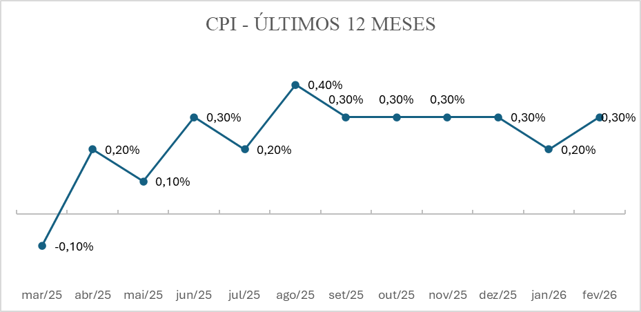 Inflação EUA (CPI): ↑ 0,3% | fevereiro/2026