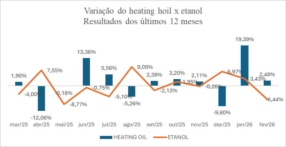 Ao longo de março, o movimento foi marcado por forte volatilidade. Após sucessivas altas, o heating oil acumulou valorização próxima de 70% no mês, atingindo máxima de US$ 4,60 em 20 de março. No entanto, na sequência, os preços passaram por um ajuste, com recuo de aproximadamente -8,76% em relação ao fechamento do dia anterior, refletindo movimentos de realização de lucros e reavaliação de riscos por parte dos investidores.