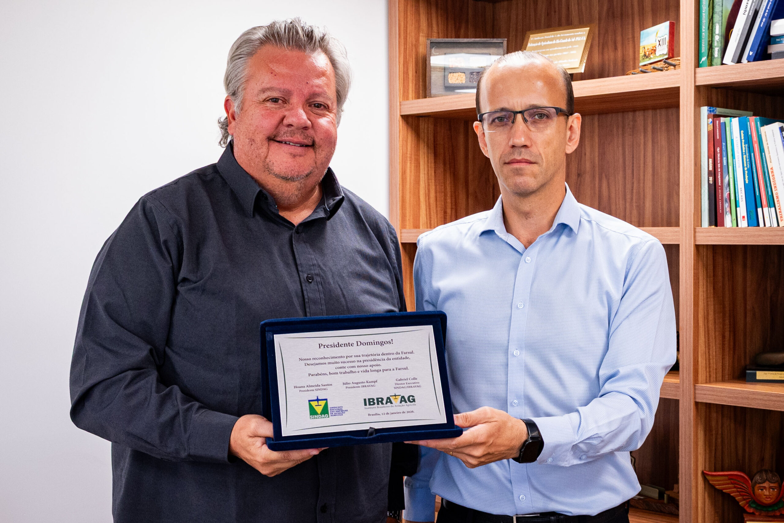 HOMENAGEM: dirigente aeroagrícola entregou homenagem do Sindag ao novo presidente da Federação da Agricultura – foto: Emerson Foguinho/Sistema Farsul