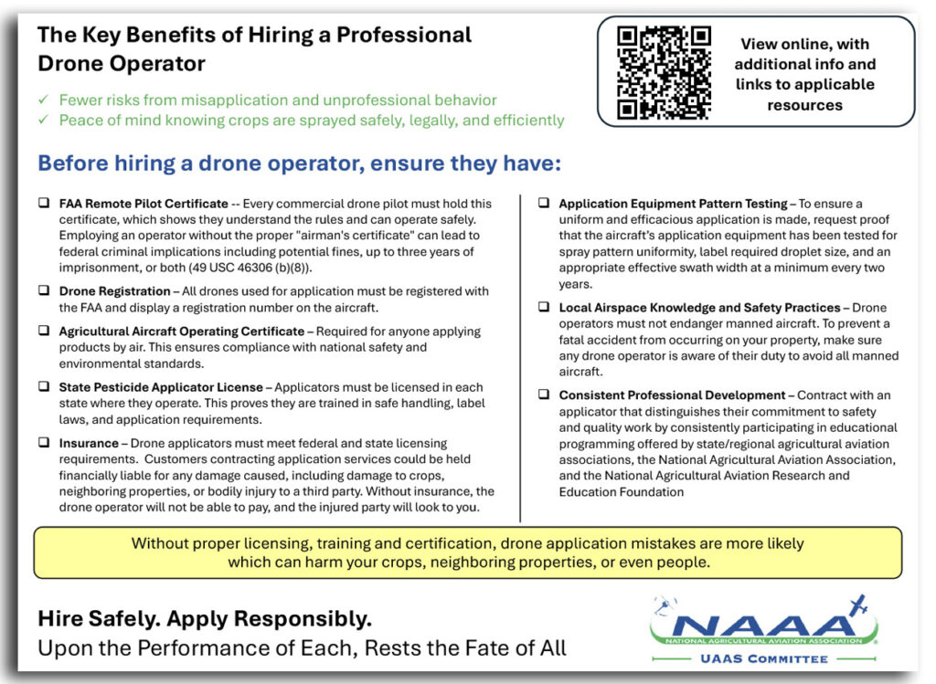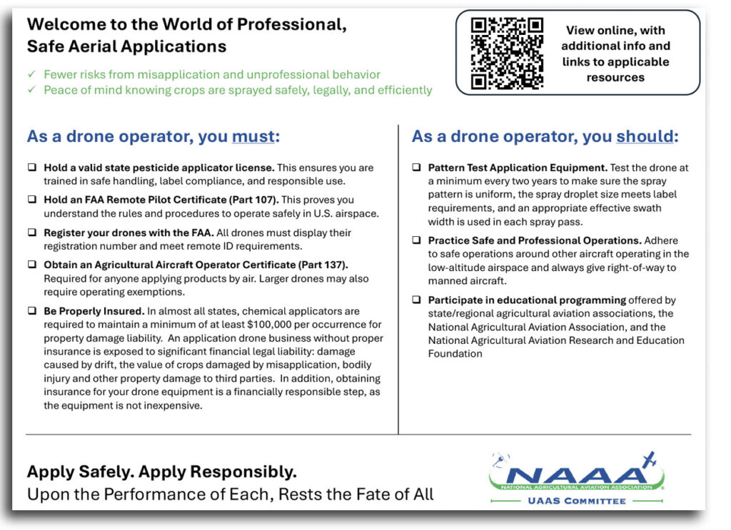 Aplique com segurança. Aplique com responsabilidade. O resultado de todos depende da conduta de cada um. Este é o slogan (traduzido) da campanha educativa iniciada pela Associação Nacional de Aviação Agrícola dos Estados Unidos (NAAA, na sigla em inglês) para reforçar regras, segurança e responsabilidade nas operações com drones agrícolas. Voltada para operadores e produtores rurais, a ação subir a régua da confiança em um mercado que cresce rapidamente — mas ainda enfrenta problemas de conformidade na terra do Tio Sam.
