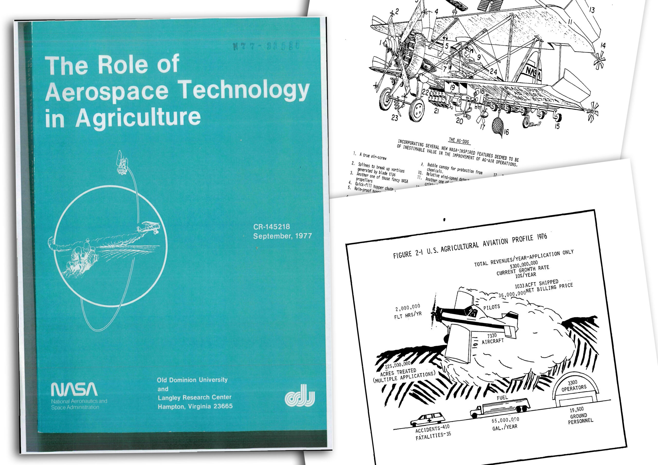 A NASA lançou um estudo sobre o papel da tecnologia aeroespacial na agricultura, enfatizando a aviação agrícola. O documento já levava em conta o desafio de produzir alimentos para uma demanda crescente da população e traçou um paralelo entre o potencial das aplicações aéreas e o monitoramento a partir de satélites.