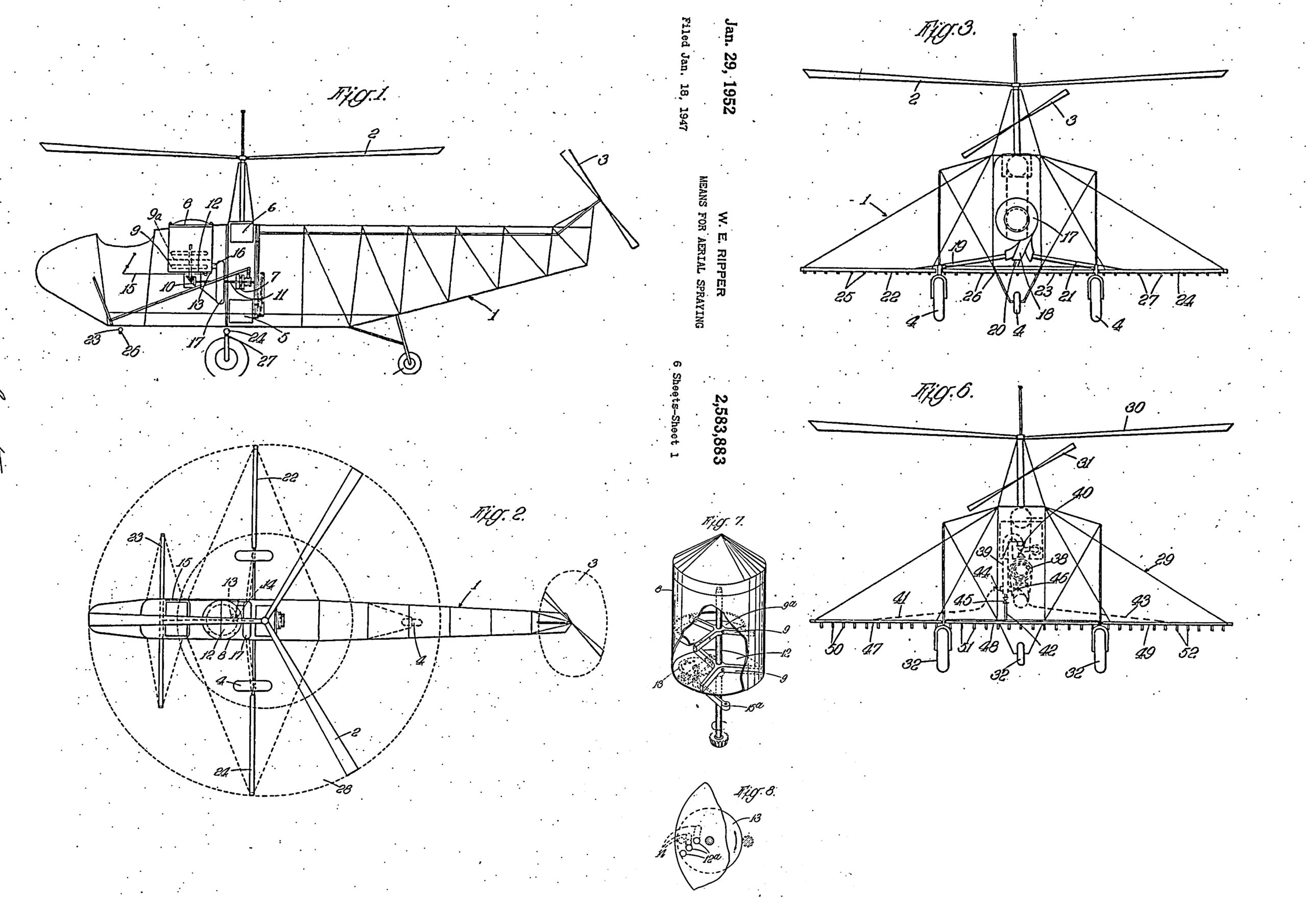 Ocorrem os primeiros testes no mundo para o uso de helicópteros em aplicações aéreas. Sob orientação do pesquisador austríaco Walter Eugene Ripper, uma das maiores autoridades na época no controle de pragas., Ele se radicou nos EUA e requereu em 1947 a patente de um sistema de pulverização para asas rotativas (foto).