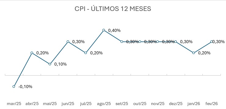 Inflação EUA (CPI): ↑ 0,3% | fevereiro/2026