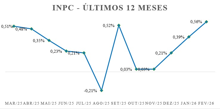 O INPC registrou alta de +0,56% em fevereiro, acima dos +0,39% de janeiro, segundo o IBGE. Com isso, o índice acumulou +0,95% no ano e +3,36% nos últimos 12 meses, abaixo dos +4,30% observados nos 12 meses imediatamente anteriores. Na composição do resultado, o IBGE destacou aceleração dos produtos alimentícios, que passaram de +0,14% em janeiro para +0,26% em fevereiro, e principalmente dos itens não alimentícios, que avançaram de +0,47% para +0,66%, exercendo maior pressão no mês.