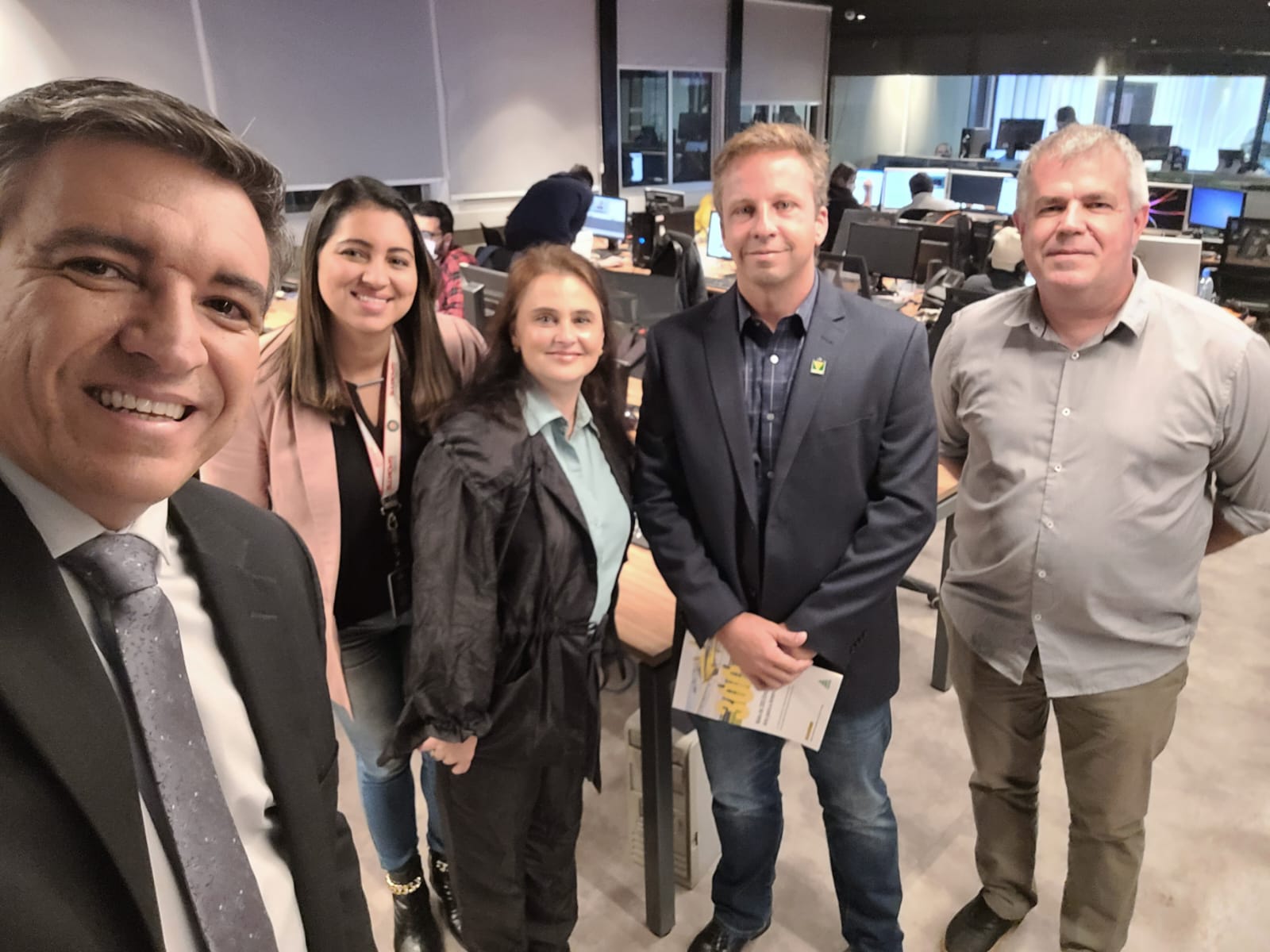 … e a comitiva do Sindag, com Becker e Graziele (ao centro), também conversou com Daiany e Márcio na redação da emissora