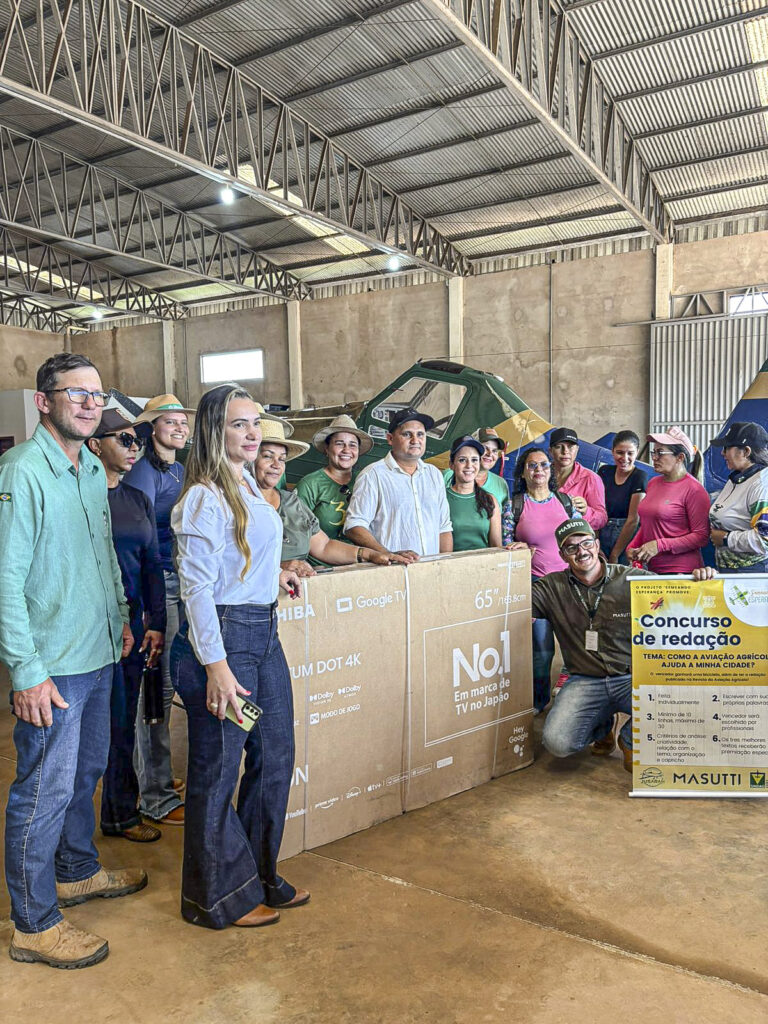 Conforme a empresária da Jusarah e conselheira do Sindag Taylla Lara Scherwinski de Faria, a visita teve ainda a entrega à escola de uma smart TV de 65 polegadas – que era uma necessidade apontada pelos próprios professores. Aliás, a primeira parte do projeto, que foi a ida de representantes da empresa à instituição em dezembro, já havia tido também a palestra sobre aviação agrícola aos estudantes.