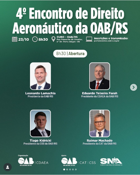 Os encontros de Direito Aeronáutico da OAB/RS ocorrem anualmente desde 2022, com o Sindag marcando presença desde a primeira edição. Além disso, a Ordem gaúcha dos advogados também inclui o setor aeroagrícola no Encontros de Direito Aeronáutico da entidade dentro da Expointer, em Esteio – que teve este ano a terceira edição.