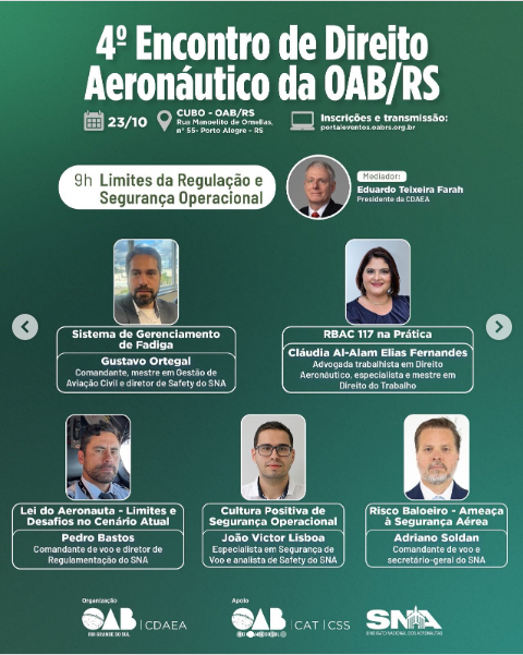 O 4º Encontro de Direito Aeronáutico terá programação o dia todo, com inscrições gratuitas e o Sindag estará no painel sobre as convenções coletivas de pilotos