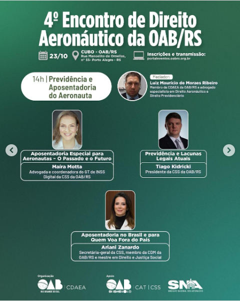 Os painéis do dia abordarão também diretrizes de Saúde e Segurança no Trabalho, Saúde e Alimentação e Saúde Mental dos profissionais do setor. Além do Gerenciamento de Fadiga, bem como Aposentadoria Especial para Aeronautas, Previdência e Lacunas Legais e outros temas.