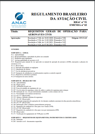 Fig. 08 – Capa do Regulamento Brasileiro de Aviação Civil (RBAC) 91, legislação da Agência Nacional de Aviação Civil (ANAC)