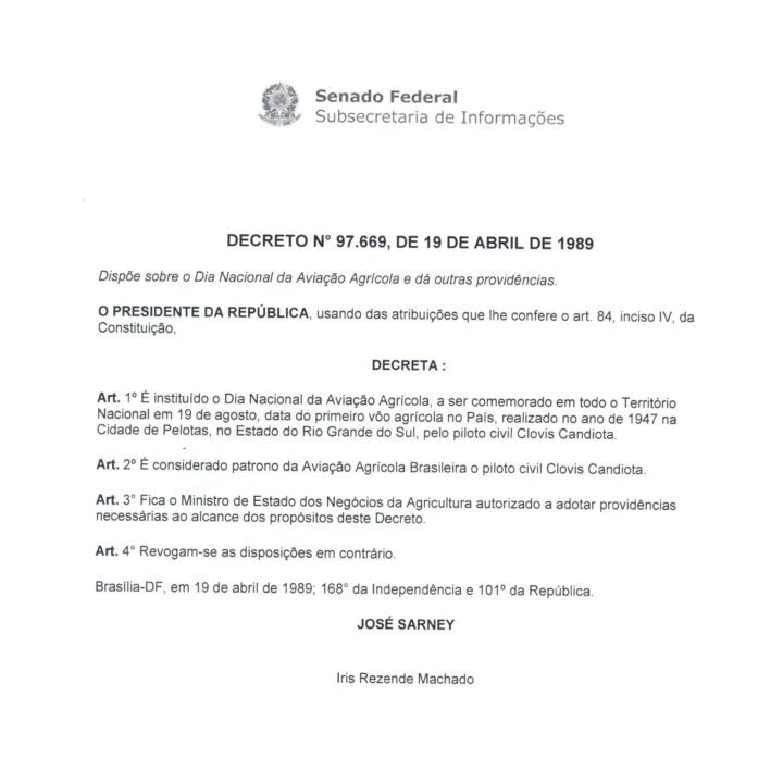 Decreto sobre o Dia Nacional da Aviação Agrícola / Nº 97.669 – 19 de abril de 1989