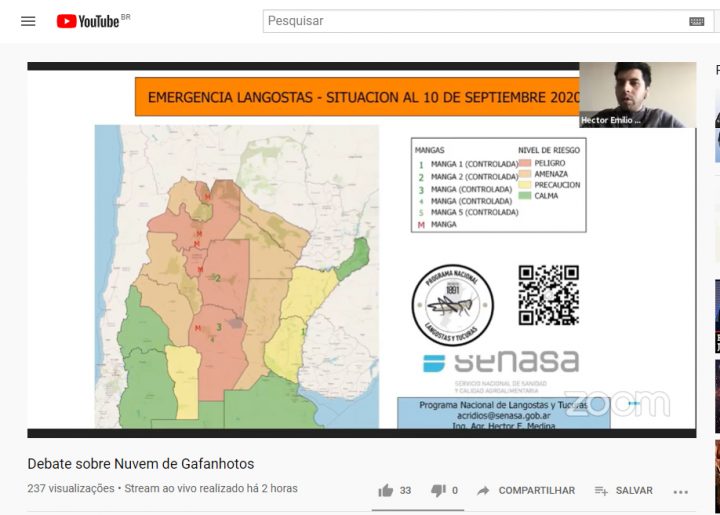O balanço foi apresentado pelo chefe do Programa Nacional de Gafanhotos e Ticuras do Senasa, Hector Emílio Medina. Foi durante o Debate Web promovido nesta quinta-feira (10) pelo Sindicato Nacional das Empresas de Aviação Agrícola (Sindag). O encontro, que ocorreu das 10 às 11h30, teve a participação também do fiscal agropecuário Juliano Ritter, da Secretaria da Agricultura, Pecuária e Desenvolvimento Rural do Rio Grande do Sul, e do agrônomo, ex-diretor e consultor do Sindag Eduardo Cordeiro de Araújo. A mediação ficou a cargo do secretário executivo do Sindag, Júnior Oliveira.