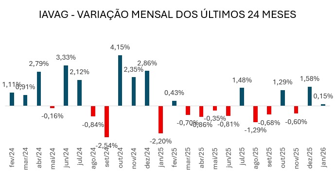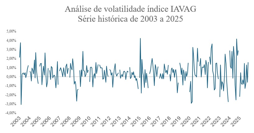 A seguir, os gráficos consolidam os principais movimentos do índice IAVAG e dos indicadores que o compõem, acompanhados ao longo do boletim. A leitura visual facilita a identificação de tendências, pontos de inflexão e períodos de maior volatilidade, complementando as análises apresentadas ao longo do texto.