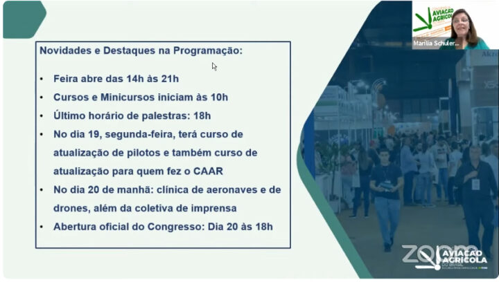 A agenda pré-feira do Congresso AvAg, na segunda-feira 19 de agosto, será com uma Clínica de Aeronaves para aviões e drones. Abrangendo paralelamente o encontro com a imprensa (para dar uma mostra aos jornalistas dos personagens e de tudo o que poderá ser visto nos três dias seguintes). Lembrando ainda os cursos de atualização de pilotos agrícolas (de aeronaves convencionais) e de operadores de drones – que também começam na véspera e terminam na manhã do primeiro dia de Congresso.