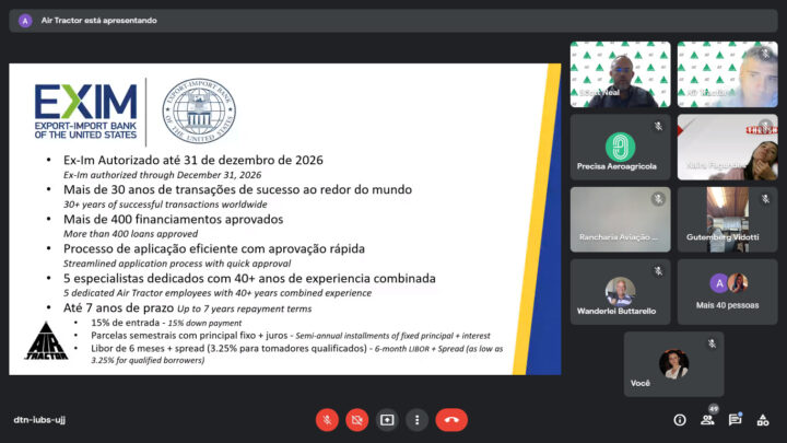 Pela Air Tractor e falando diretamente de Olney, Texas, o presidente da empresa, Jim Hirsch, agradeceu a dedicação da equipe do Sindag para fazer o evento acontecer. “Também somos gratos pela oportunidade de participar e esperamos que todos que assistiram às nossas palestras desta semana tenham apreciado e tirado proveito de seu conteúdo”, destacou o executivo norte-americano. Ele também ressaltou que a Air Tractor (maior fabricante mundial de aviões agrícolas) segue mantendo foco importante no Brasil. E deve continuar assim por muito tempo, “com aviões à disposição para ajudar a agricultura local”.