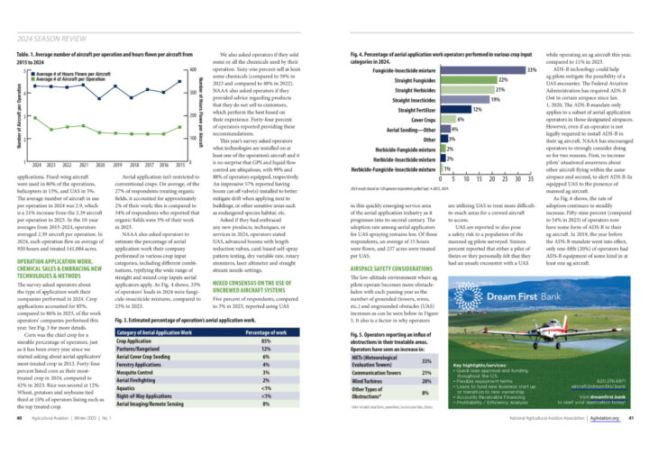Os dados foram publicados na AgAviation Magazine, da NAAA. Esta foi a 13ª pesquisa anual da NAAA, que em setembro enviou os formulários para os 1.044 operadores (membros e não-membros) constantes no banco de dados da instituição. Conforme a entidade, os 207 participantes (19,6% do total) foram o suficientes para dar uma margem de erro de +/- 5% à pesquisa, que se repete desde 2011. O estudo também apontou no ano passado uma média de 2,9 aeronaves por operador, 21% a mais do que as 2,39 aparelhos em 2023.