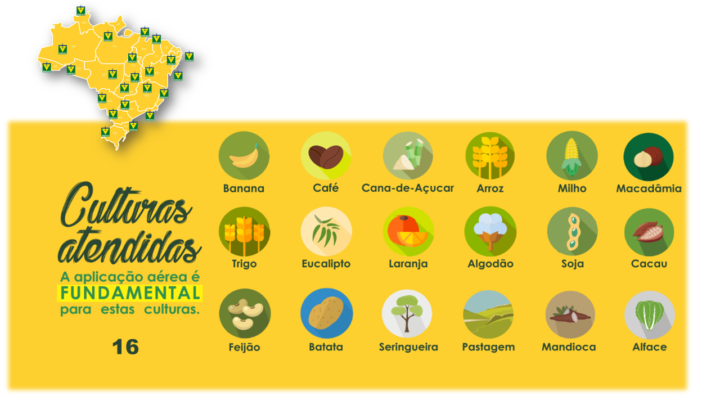 A Aviação agrícola é fundamental para mais de 15 culturas no Brasil sendo algumas delas: cana de açúcar, café, arroz, soja, milho, trigo, algodão, banana, laranja, eucalipto, seringueira, feijão, batata, mandioca, macadâmia e pastagem.